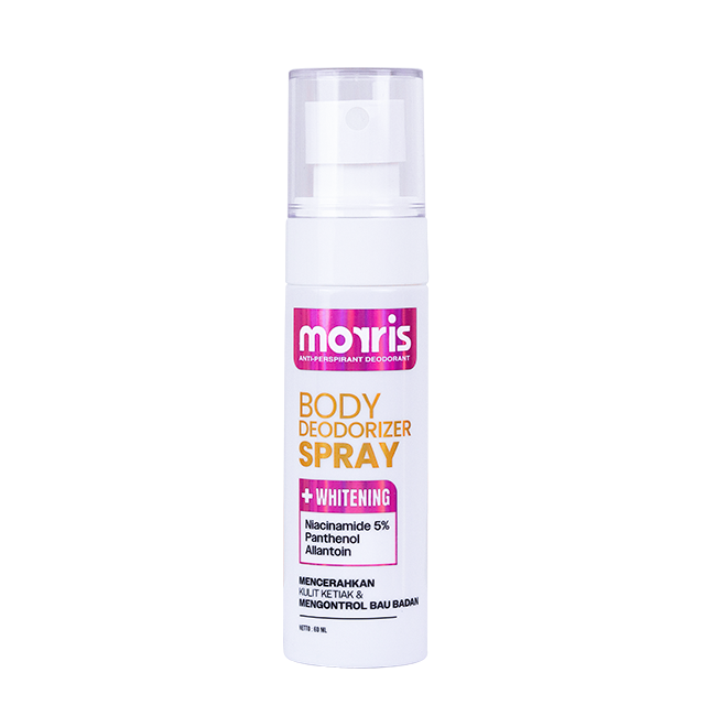 Morris Body Deodorizer Spray + Whitening merupakan Ultra-Light Mist—MaximumProtection deodorant spray dengan formula perlindungan ganda antiperspirant + Odor control yang sangat efektif membantu mencegah pertumbuhan bakteri penyebab bau badan, dengan high concentrate active content dari niaciamide 5% nya membantu mencerahkan kulit ketiak yang gelap.